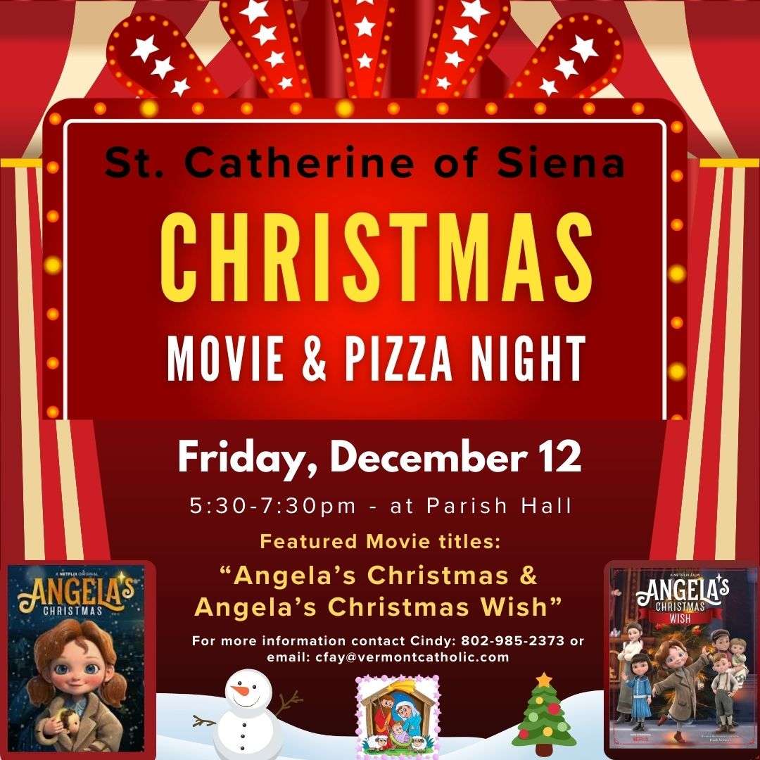 Please bring your family to this year's Christmas Movie and Pizza night in St. Catherine's. The event will take place in the Parish Hall at 5:30-7:30 pm on Friday, December 12, 2025. We have chosen two short movies "Angela's Christmas" and the sequel "Angela's Christmas Wish". The sign up link is below, we need to order PIZZA! It should be a festive and fun filled evening for all.