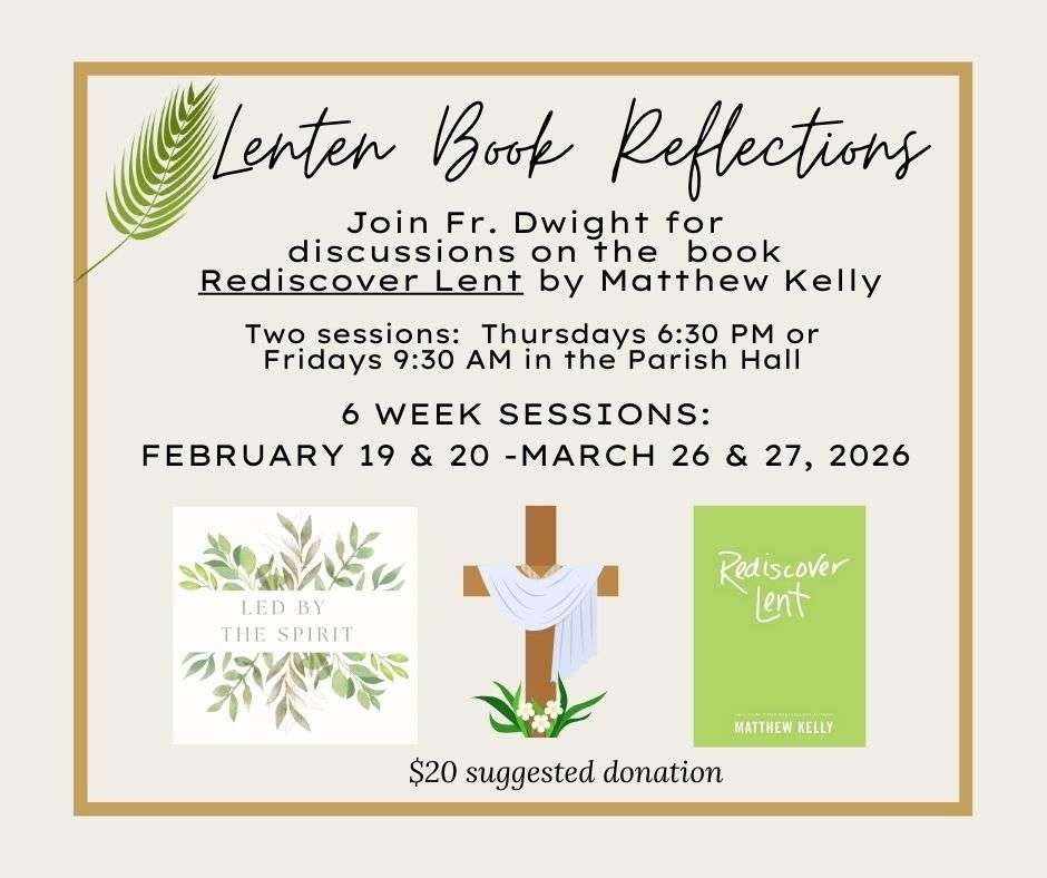 Lenten Book Reflections. Join Fr. Dwight for discussions on the book, Rediscover Lent by Matthew Kelly. There will be two sessions: Thursdays 6:30-7:30 PM or Fridays 9:30-10:30 AM. The 6 week sessions will begin on Feb 19 & 20 through March 26 & 27, 2026. Suggested Donation $20.